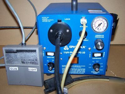 The PC-3D consists of a housing containing a 50 Watt power supply, circuit protection, power-on light, lamp/reflector assembly, cooling fan, lightguide mount and electric shutter. Electric shutters are supplied with timed an manual operating modes. The lightguide is separate and plugs into the mount on the front of the unit. The adhesive dispenser is designed to dispense adhesive from a 10ml or 30ml syringe. Adhesive dispensing is done with an air pressure/dispense timer system. A vacuum draw back feature is included to prevent dripping of low viscosity adhesives, and operation is controlled by a foot switch, which initiates the dispensing cycle. Initiating the dispense cycle causes the dispensing timer to energize a solenoid valve for a predetermined time. In the manual mode, the solenoid valve is energized directly.
