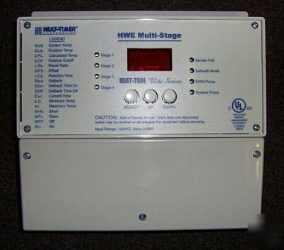 For sale is one new HWE Multi Stage Boiler Control made by HeatTimer, HWE multi stage boiler control, reset control for up to four boiler stages, includes lead stage rotation and DHW priority, w/digital display, outdoor and heating system sensors, and outdoor reset.