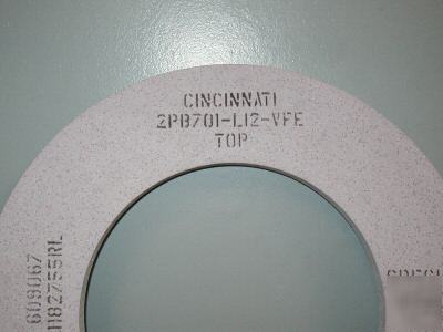 Brand New in the Box Cincinnati 20% Ceramic Blend Aluminum Oxide Grinding Wheel, 2PB701L12VFE 20" (OD) x 1" (W) x 12" (ID), Great for machining metals up to 62 HRC and able to achieve 12 RA micro surface finish. This grade is extremely wear resistant, holds form for extended time, yet friable enough to inhibit machineability.