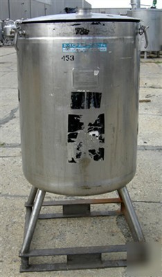 USED: Walker kettle, 100 gallon, 316 stainless steel, vertical. 28" diameter x 35" straight side, open top with a 1-piece hinged cover, dish bottom. 304 stainless steel jacket rated 92 psi at 325 deg F, 1/2" diameter bottom internal coil assembly, approx 16 turns (no rating). Openings: top 1" NPT, 1-1/2" tri-clamp, 3" tri-clamp. Approx 1-1/2" sanitary threaded center bottom outlet. Mounted on (4) stainless steel legs with forklift entry. Built 1972.