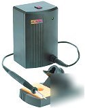 With this easy-to-use, compact soldering system, technicians need only select the correct tip cartridge, insert it into the handpiece, and switch on. As the unit works at a lower temperature than a conventional iron and requires no calibration, operators always apply the correct level of thermal energy needed to produce solder joints of the highest quality without risking component or PC board damage. In addition, the system's design is extremely reliable, with very few parts that ever need repairing, ensuring practically maintenance-free operation. System is ESD-safe and meets Mil-Specs. Operates on 115VAC and includes power supply with power cord, soldering handpiece (without tip cartridge), workstand with sponge, and cartridge removal pad.